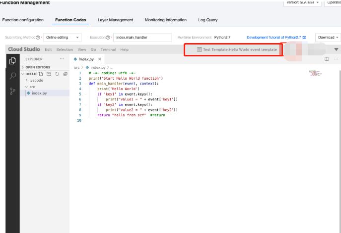 On the Function Management page, select Function code and click Test to run the code with the test result returned as shown below: