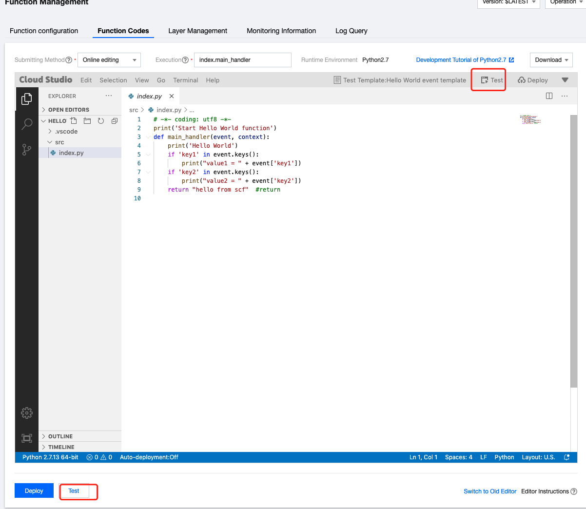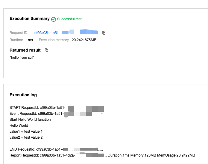 During this test, SCF will get the data structures of the "Hello World event template" in the event parameter of the main_handler. {