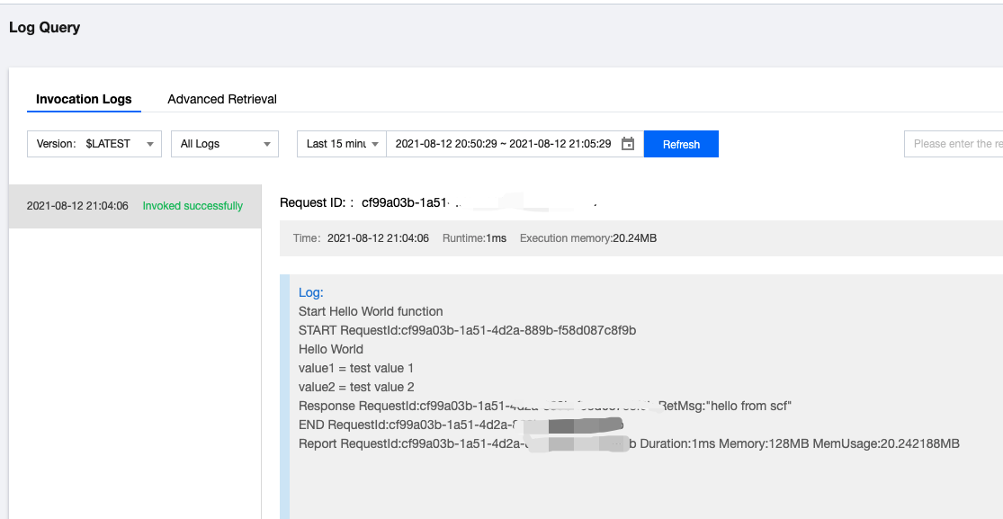 On the details page of a created function, select Log Query on the left to view the detailed logs of the function as shown below:
