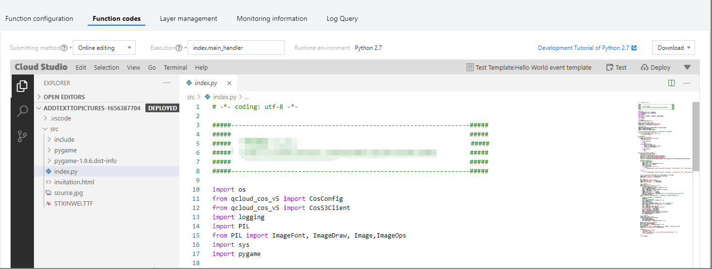 7. After you click Deploy, the dependency library can be packaged and uploaded to the cloud together with the function code. Python runtime
