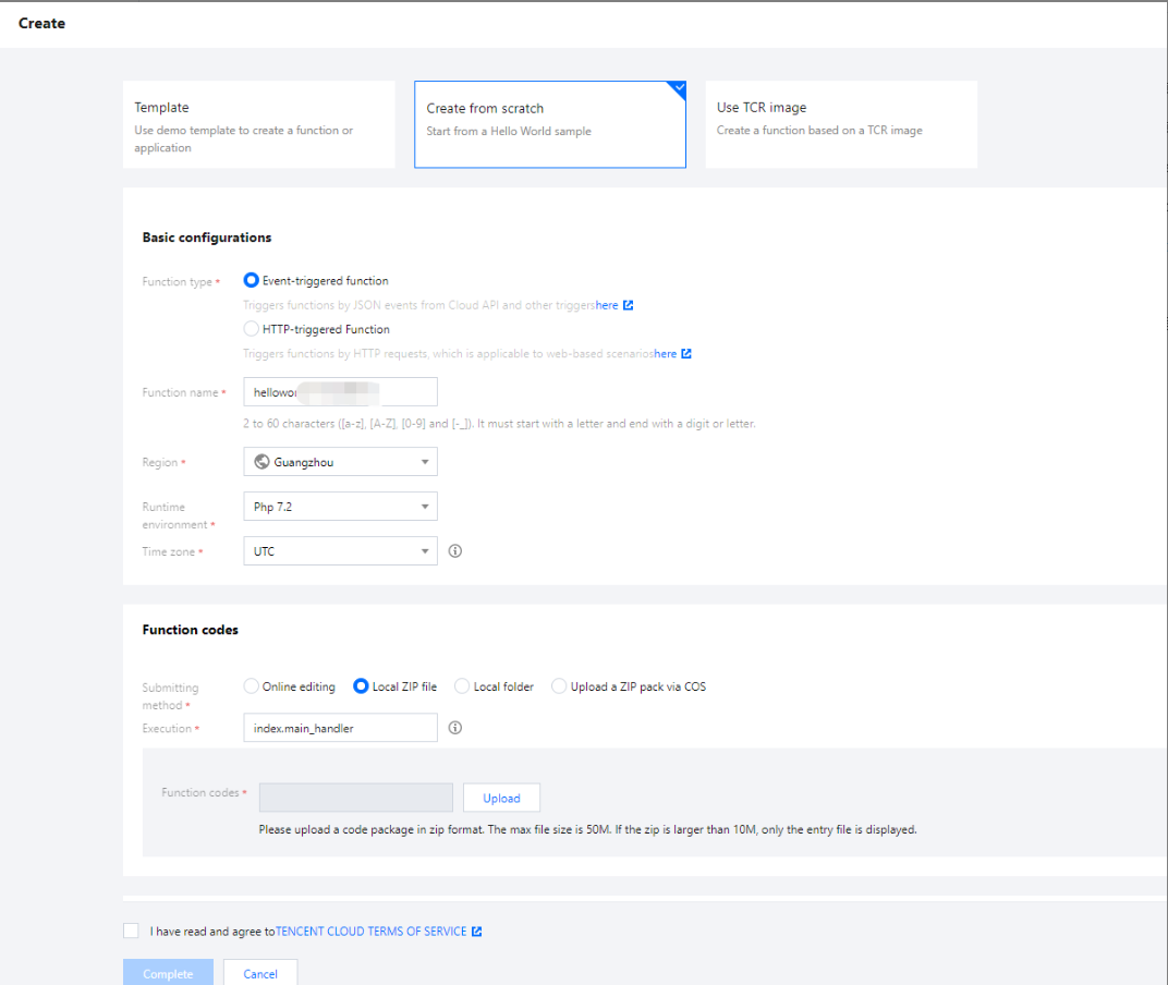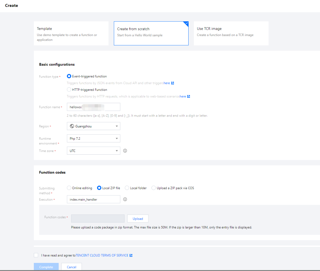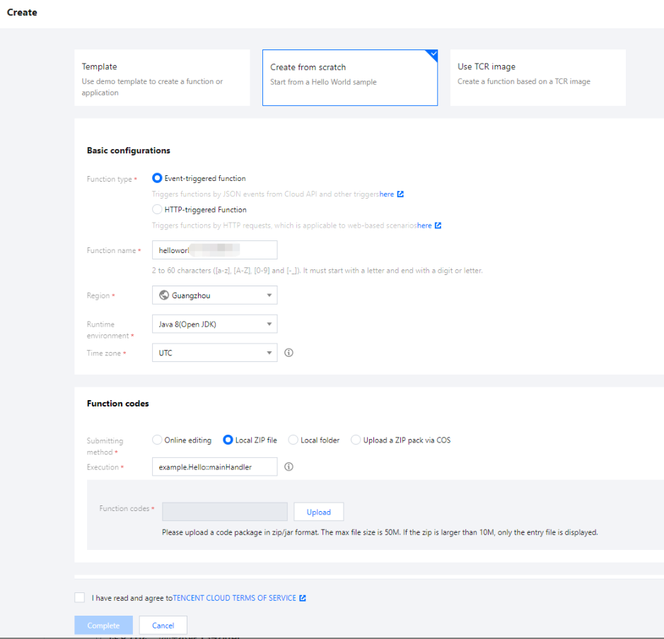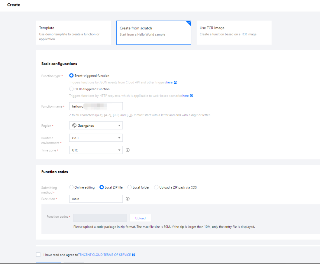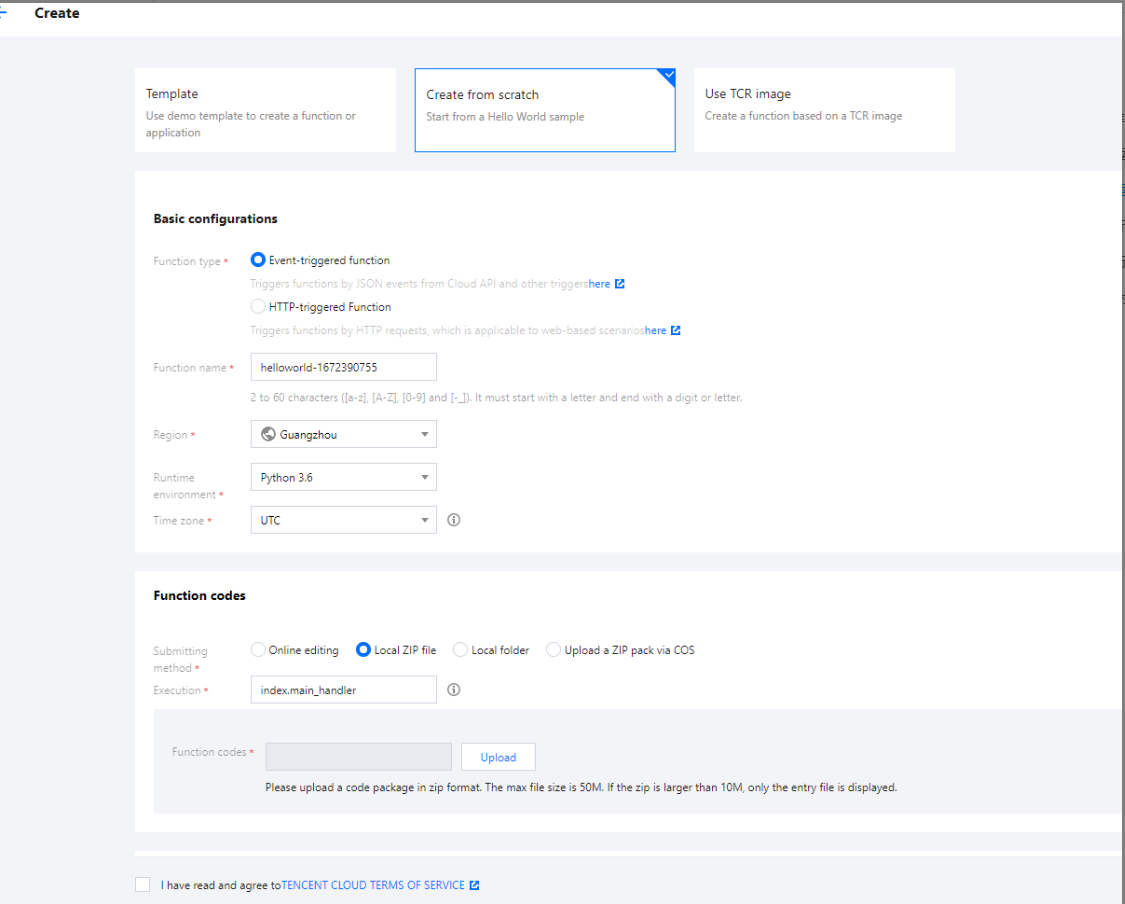 6. Compress the function code and dependent library to a zip package. Upload the zip package and create a function via the SCF console.