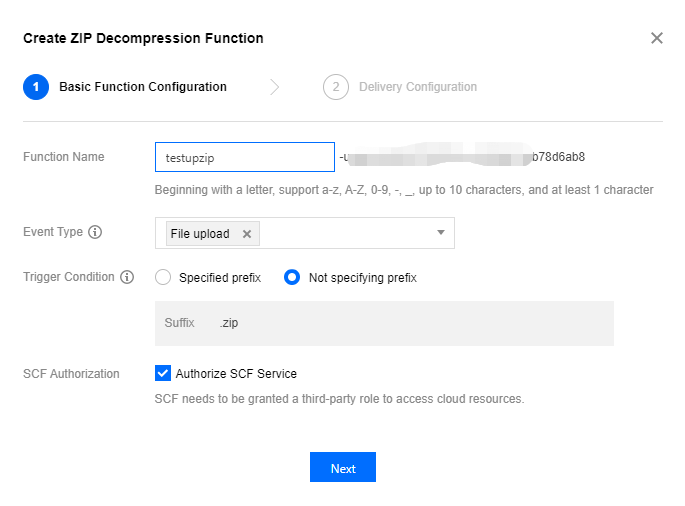 2. Click Add Function and configure the following parameters. Function Name: A function will be automatically created in the corresponding region. The function name uniquely identifies the function and cannot be modified after creation. You can view the function in the SCF console. Event Type: An event is an operation that triggers SCF. Take upload as an example. You can initiate an upload by calling the PUT Object or POST Object API. If you select Creation using Put method as the event type, decompression will be triggered only by a package uploaded via the PUT Object API.