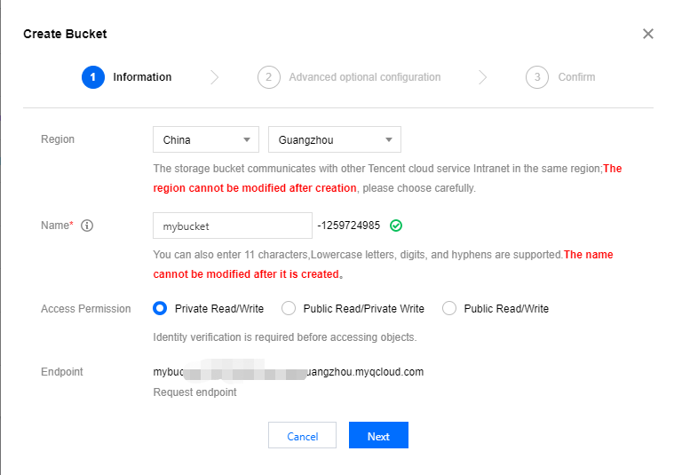 Advanced settings are optional and can be set as needed. For parameter details, see Creating Bucket. 4.3 Configuration confirmation