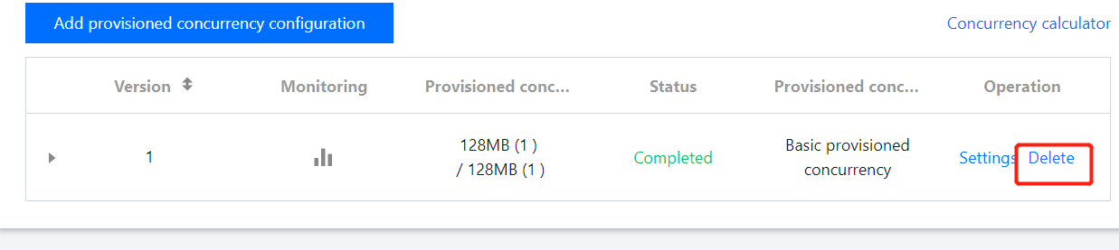 4. On the Provisioned concurrency tab, select Delete on the right of the target version as shown below: