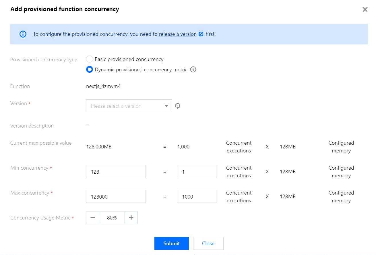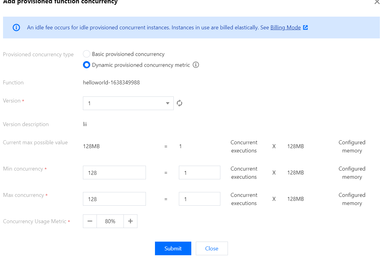 5. In the Add provisioned function concurrency pop-up window, select Dynamic provisioned concurrency metric for Provisioned concurrency type, select the function version, set Min concurrency, Max concurrency, and Concurrency usage metric based on the business scenario, and click Submit as shown below: