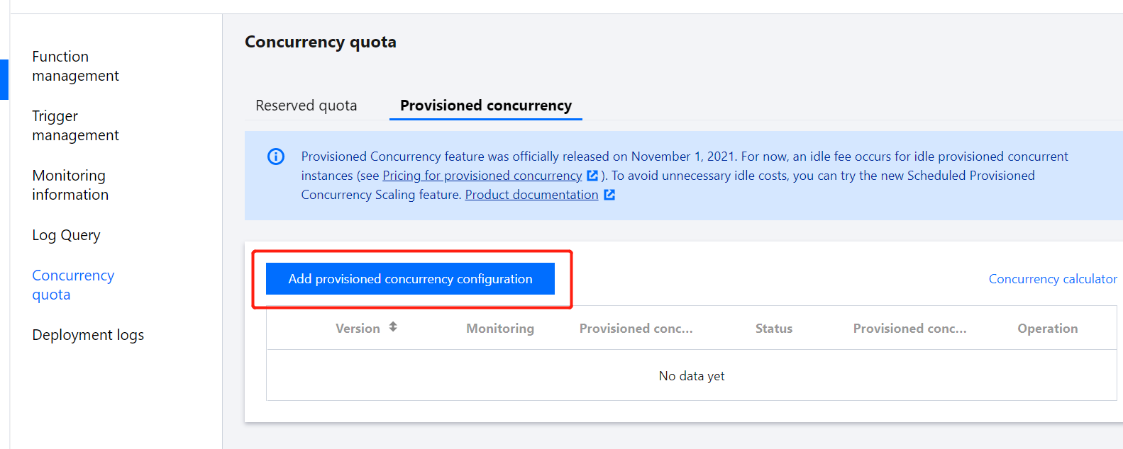 3. On the left, select Concurrency quota > Provisioned concurrency to enter the Provisioned concurrency tab.