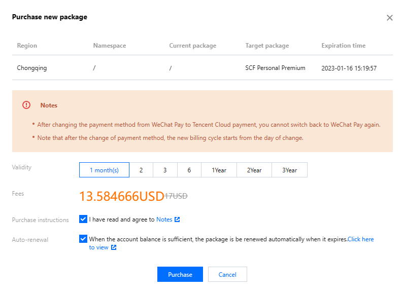 SCF supports pay-as-you-go billing, and offers prepaid subscription packages.
