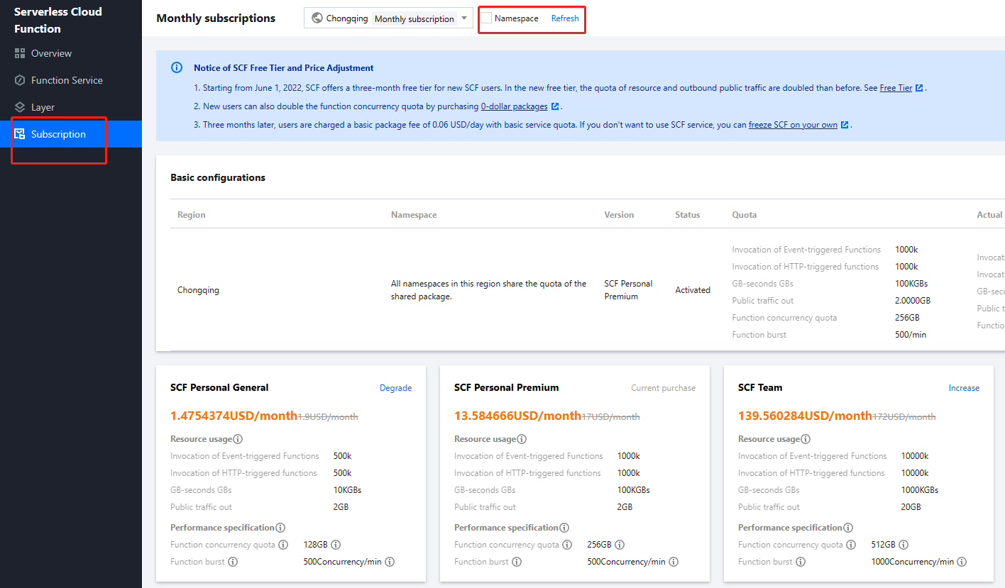 SCF offers seven types of packages, including Personal General, Personal Premium, Team, Enterprise Basic, Enterprise General, Enterprise Premium and Enterprise Ultimate. Each type contains different quota of function resource usage, invocations, outbound traffic, concurrent functions and function burst.