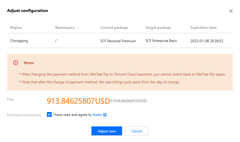 3. In the Adjust configuration pop-up, confirm the information, read and agree to the reminder, and click Adjust now. 4. Confirm the information and click Submit order.