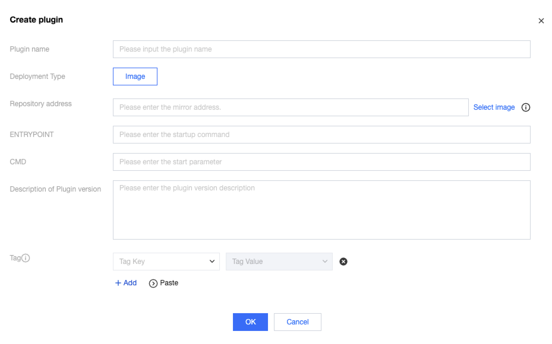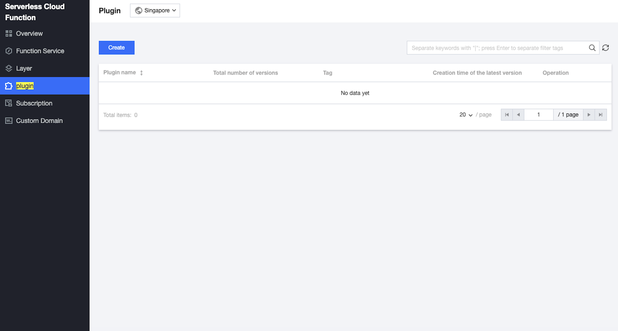 1. Log in to Serverless Console and select Advanced Capability > Plug-in in the left sidebar. 2. On the Plugin page, select the region where you need to use the plugin and click Create.