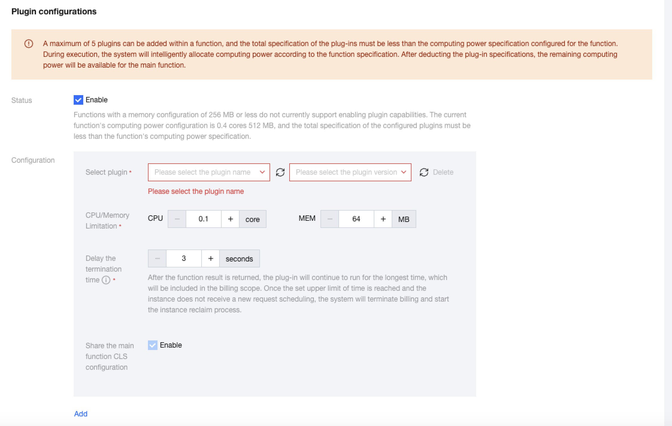 Select the corresponding plug-in to bind, and set the CPU and memory specifications, delay termination time, and whether to share CLS configuration assigned to the plug-in.