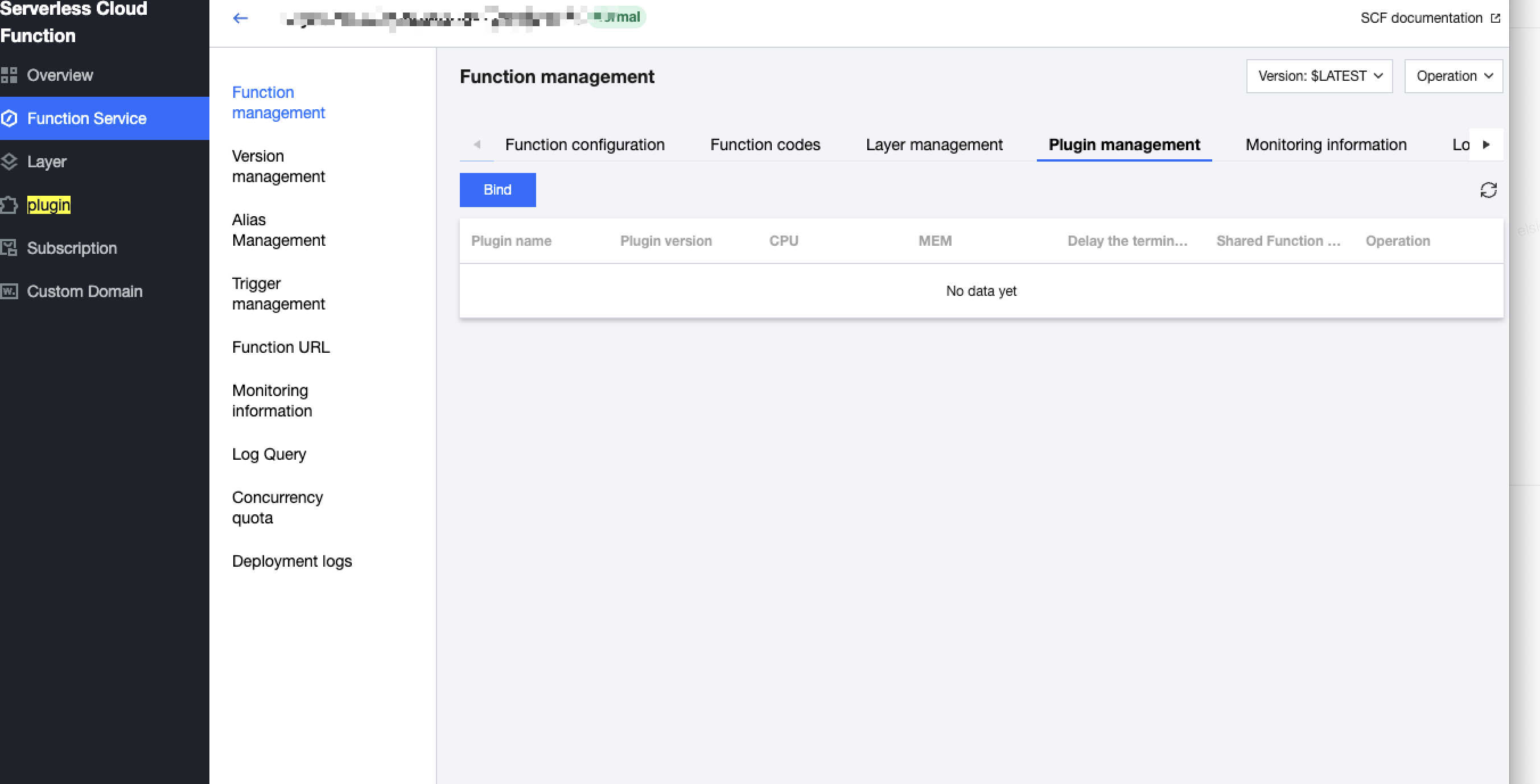 1. Log in to Serverless Console, select Function Service in the left sidebar, and enter the "Function Service" list page. 2. Can bind a plugin directly in advanced configuration when creating a function, or edit an existing function and perform binding on the Plugin Management tab.