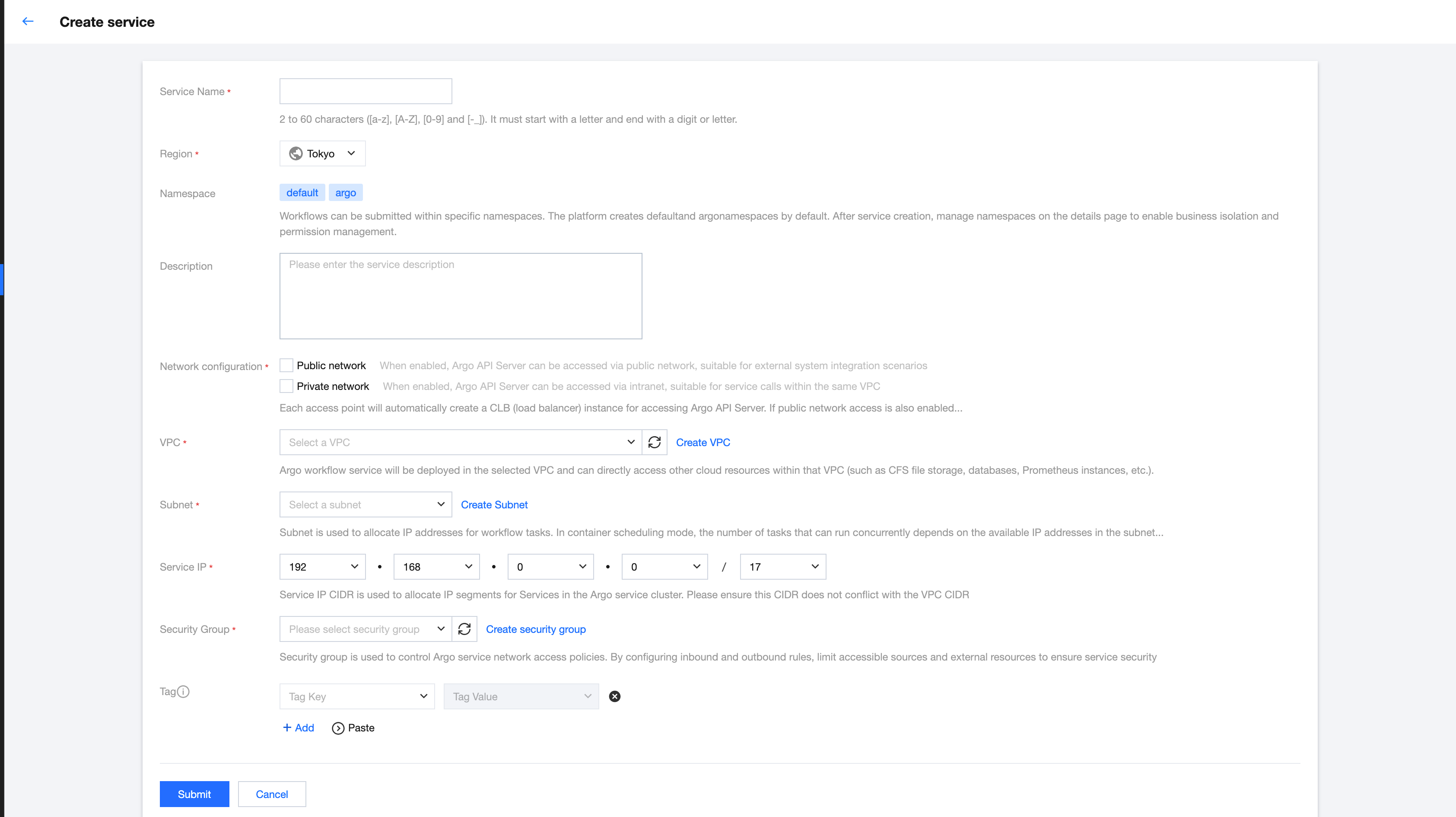 Subnet: You can select multiple subnets, with a default upper limit of 5. To increase the upper limit, submit a ticket. Subnets are used to allocate IP addresses for workflow tasks. In container scheduling mode, the number of tasks that can run concurrently depends on the number of available IP addresses in the subnet. In single-function scheduling mode, the number of workflows that can run concurrently depends on the number of available IP addresses in the subnet. Selecting subnets of different AZs enables cross-AZ deployment, improving service high availability and disaster recovery capability. Service IP: The Service IP range is used to assign an IP range for the service in the cluster where the Argo service resides. Make sure that this IP range does not conflict with the VPC IP range.