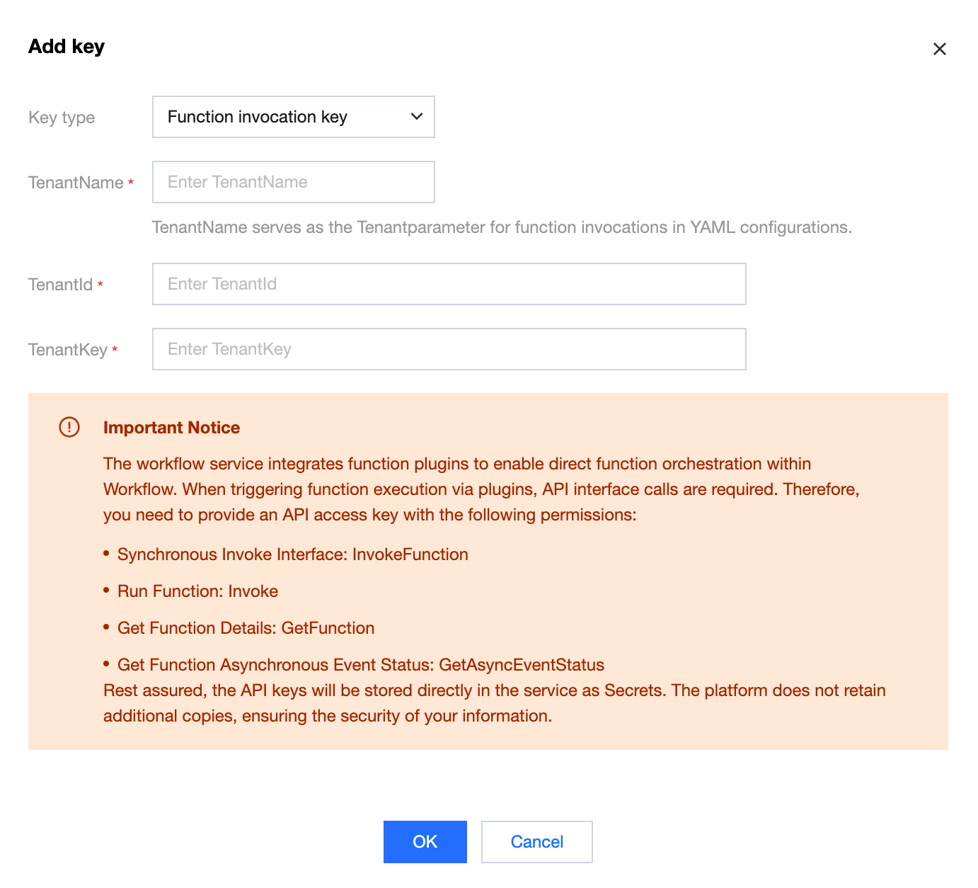 3. Enable the advanced feature "function mode initialization". During initialization, go to the Key Management tab to add a function invocation key. Provide an API access key with the corresponding access permissions as prompted on the page. After the configuration is completed, the initialization process finishes, enabling you to directly orchestrate functions in the workflow YAML file.