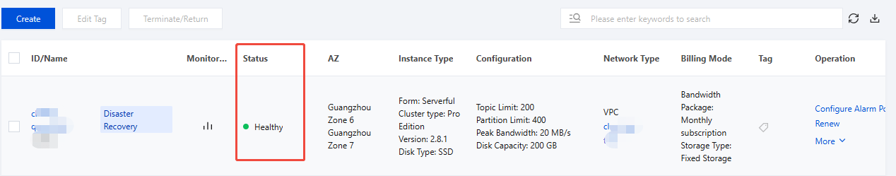 CKafka has an inspection program for each instance. The inspection program checks the number of connections, disk usage percentage, production peak bandwidth, and consumption peak bandwidth of the instance. When these metrics exceed certain thresholds, different health statuses will be generated. For detailed status, see Monitoring Metrics and Anomaly Explanation. 2. Click Instance List on the left navigation bar. After selecting a region, you can check the health of clusters in the status bar of the cluster list. If the cluster status is abnormal, you can click the button in the status bar to view detailed prompt messages.