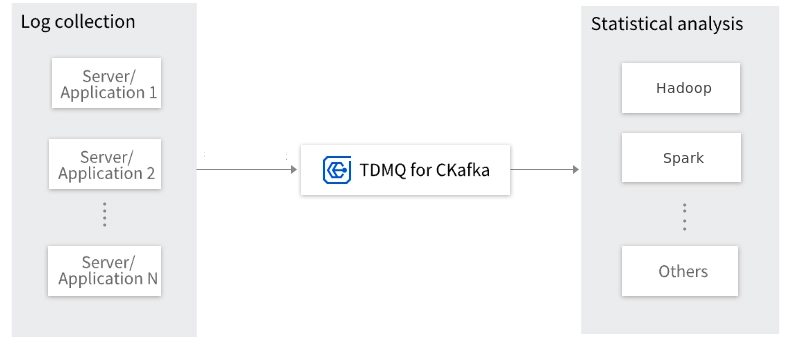 CKafka's characteristics make it ideally suited as a log collection hub. Multiple hosts and applications can asynchronously send operation logs to CKafka clusters in batches without storing them locally or in databases. CKafka can submit messages in batches, imposing almost imperceptible performance overhead on producers. Consumers can then use specialized storage and analysis systems like Hadoop, Flink, and Spark to perform statistical analysis on the pulled logs.