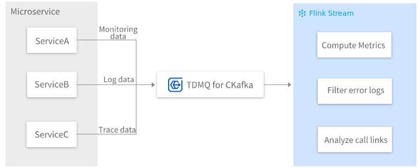 In a typical microservice architecture, the system consists of multiple independent services, each generating substantial monitoring data (such as CPU and memory utilization), log data (such as request logs and error logs), and trace data (such as service call chains). To achieve comprehensive system observability, the data can be uniformly collected and sent to CKafka. Downstream systems then consume the data in real time through Flink Stream for aggregation, analysis, and exception detection, enabling the Ops team to rapidly identify and resolve issues, thereby enhancing system stability and maintainability.