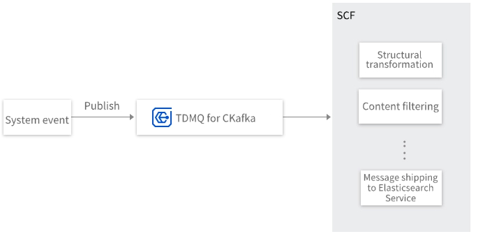 CKafka can serve as a Serverless Cloud Function (SCF) trigger. When messages are received in a message queue, SCF is triggered, and the messages are passed as event content to SCF. For example, when triggered by CKafka, SCF can perform operations such as structural transformation and content filtering on the messages, or deliver them to Elasticsearch Service (ES).
