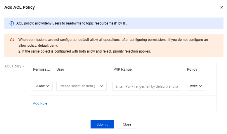 An ACL policy is a group of user-defined permission rules that allow/deny users to read/write Topic resources through IP.