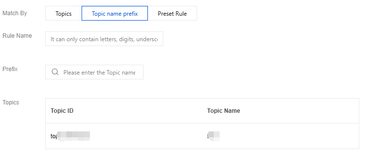 Kafka version instances 2.4.1 and above support three ways to select effective Topics: batch selection, prefix fuzzy match, and preset rules. Kafka version instances below 2.4.1 only support two ways: batch selection and preset rules. You can view configuration instructions for different match modes through the following tabs: