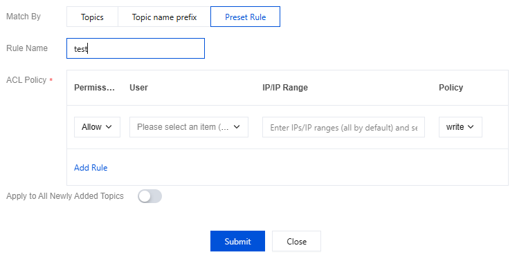 Set up an ACL policy. Once created, you can select and configure this ACL policy in advanced parameter settings when creating a new topic. For details, refer to Create Topic. Rule name: Set the name of the preset rule, comply with naming convention, start with a letter, can only contain letters, digits, underscore, "-", "."