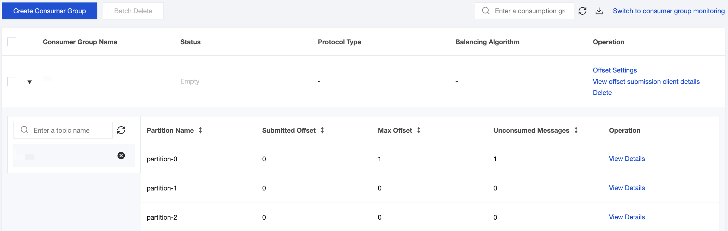 Operation | Click View Details in the Operation column of the partition to view the offset consumption status at the partition level. |
