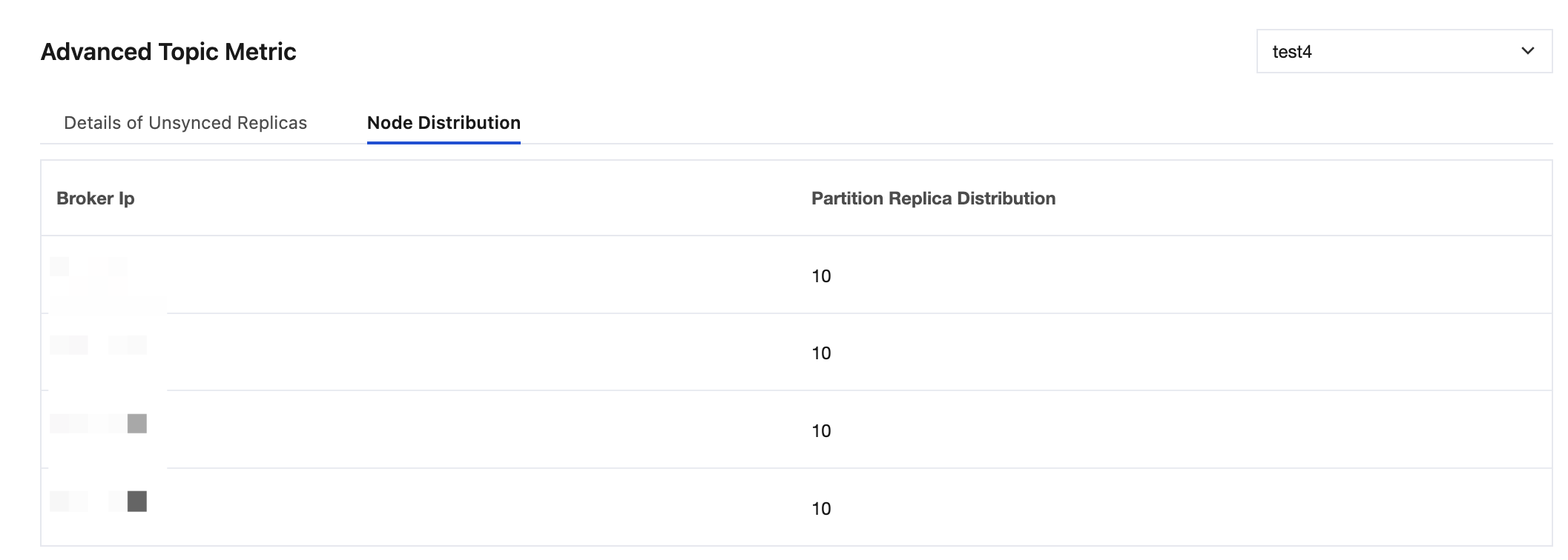 Live Broker NodesLive Broker Nodes | The service status of each broker node. This metric allows you to monitor node availability through the heartbeat mechanism.The service status of each broker node. This metric allows you to monitor node availability through the heartbeat mechanism. | The normal value is 100%.The normal value is 100%. If the node liveness rate is below the normal value, namely, a broker is down, it will trigger in-sync replica (ISR) shrinking.If the node liveness rate is below the normal value, namely, a broker is down, it will trigger in-sync replica (ISR) shrinking. | When the node status is abnormal, it is recommended to immediately restart the faulty node and check the system resource usage.When the node status is abnormal, it is recommended to immediately restart the faulty node and check the system resource usage. If multiple restart attempts fail, contact If multiple restart attempts fail, contact online customer serviceonline customer service.. |