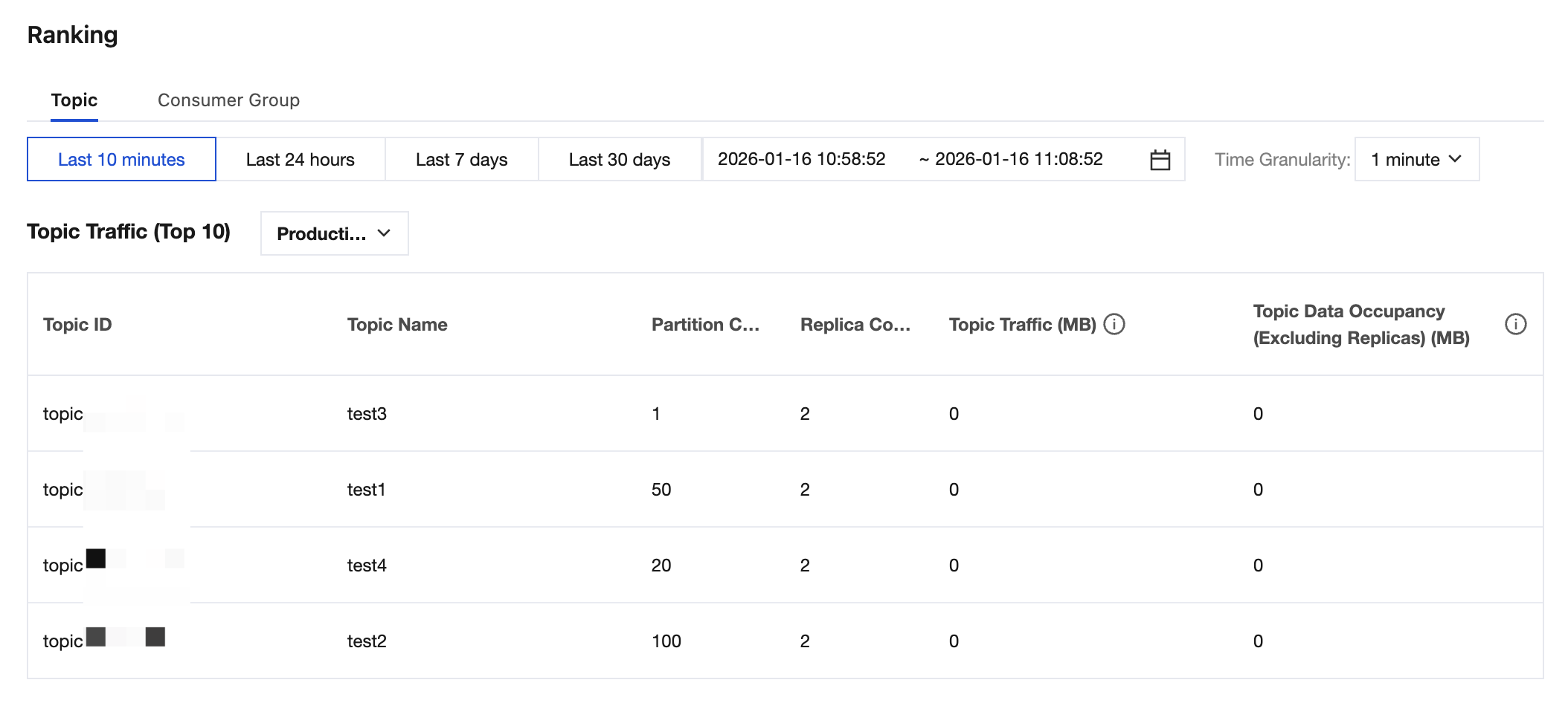 partition produce flow | MB | Actual production traffic of a partition (excluding the traffic generated by replicas). It is summed according to the selected time granularity. |