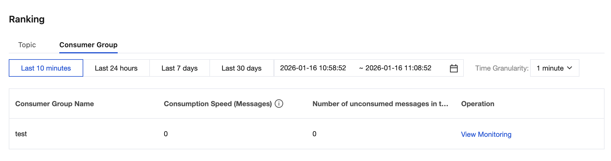partition consumegroup consume speed | Count/min | Consumption rate of the consumer group in the current partition (messages per minute). |