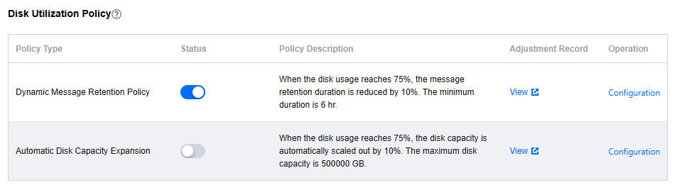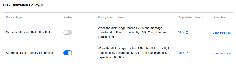 Automatic disk capacity expansion: When disk load becomes excessive, messages cannot be normally produced or consumed. With an automatic disk capacity expansion policy set, if disk load reaches the trigger threshold, the system will automatically adjust disk capacity according to the expansion policy to prevent such a situation.