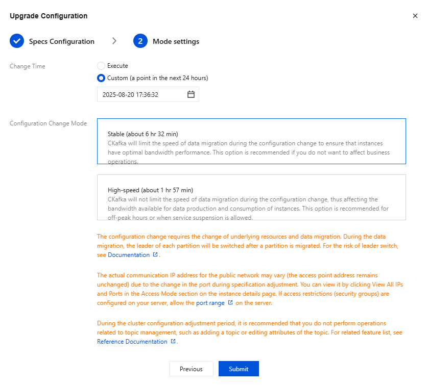 Stable Mode: CKafka will limit the data migration speed during configuration changes to preserve the bandwidth properties of the instance to the greatest extent. This mode is suitable for scenarios where business disruption is undesirable.