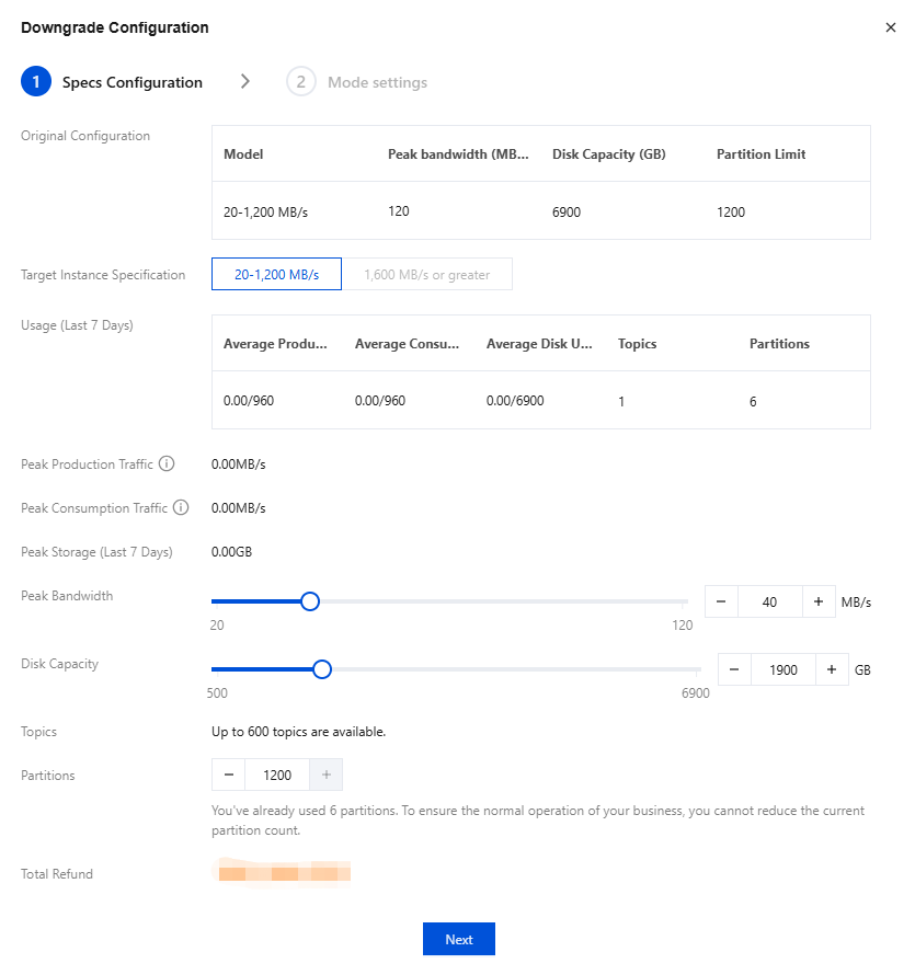 5. Check the resource usage of the instance in at least the last 7 days before downgrading the specifications. If the peak bandwidth or peak storage of the instance in the last 7 days exceeds the target downgrade specifications, proceeding with the downgrade may cause damage to your business. Decide whether to perform the downgrade operation based on your actual business requirements.