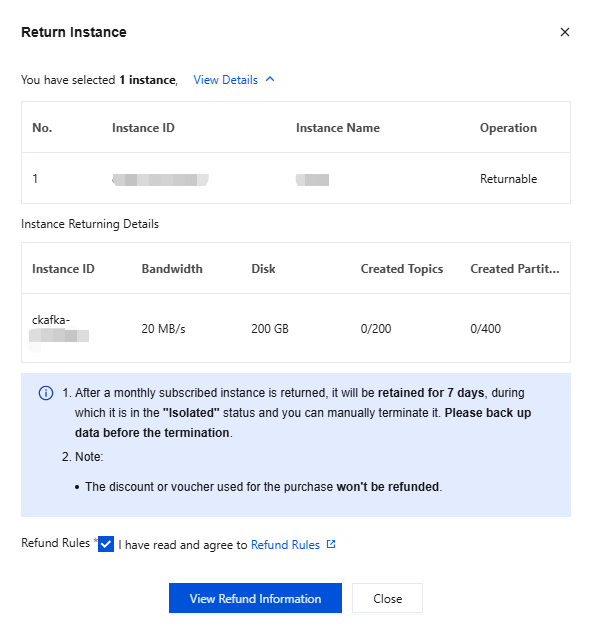 4. Confirm the resources to be returned and read the refund rules in the termination pop-up window, then click View Refund Info.