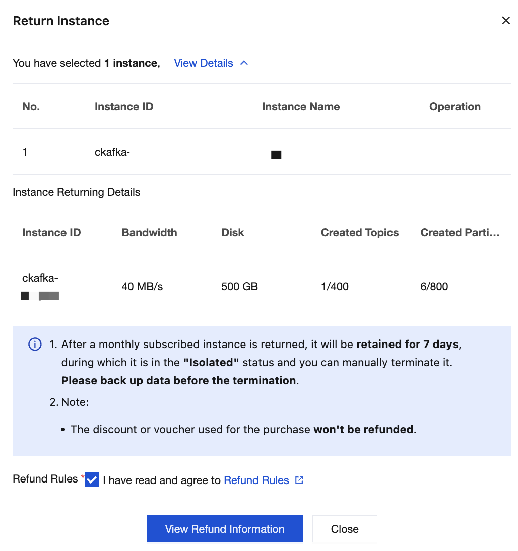 4. In the pop-up window for requesting an instance return, confirm the details of the resources, read the refund rules, and then click View Refund Information.