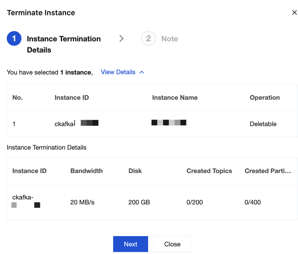 4. In the pop-up window for confirmation of the deletion, confirm the deletion details and click Next. In the confirmation pop-up window, click Confirm Deletion to delete the instance.