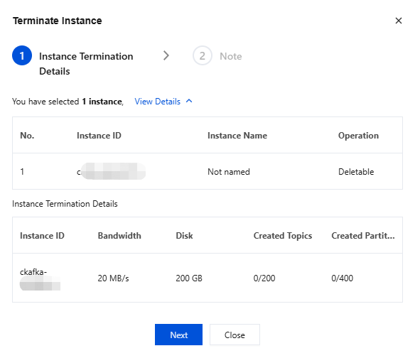 4. After confirming the destruction details in the pop-up window for terminating the instance, click Next, then click Confirm Destruction in the pop-up window for confirming termination to destroy the instance.