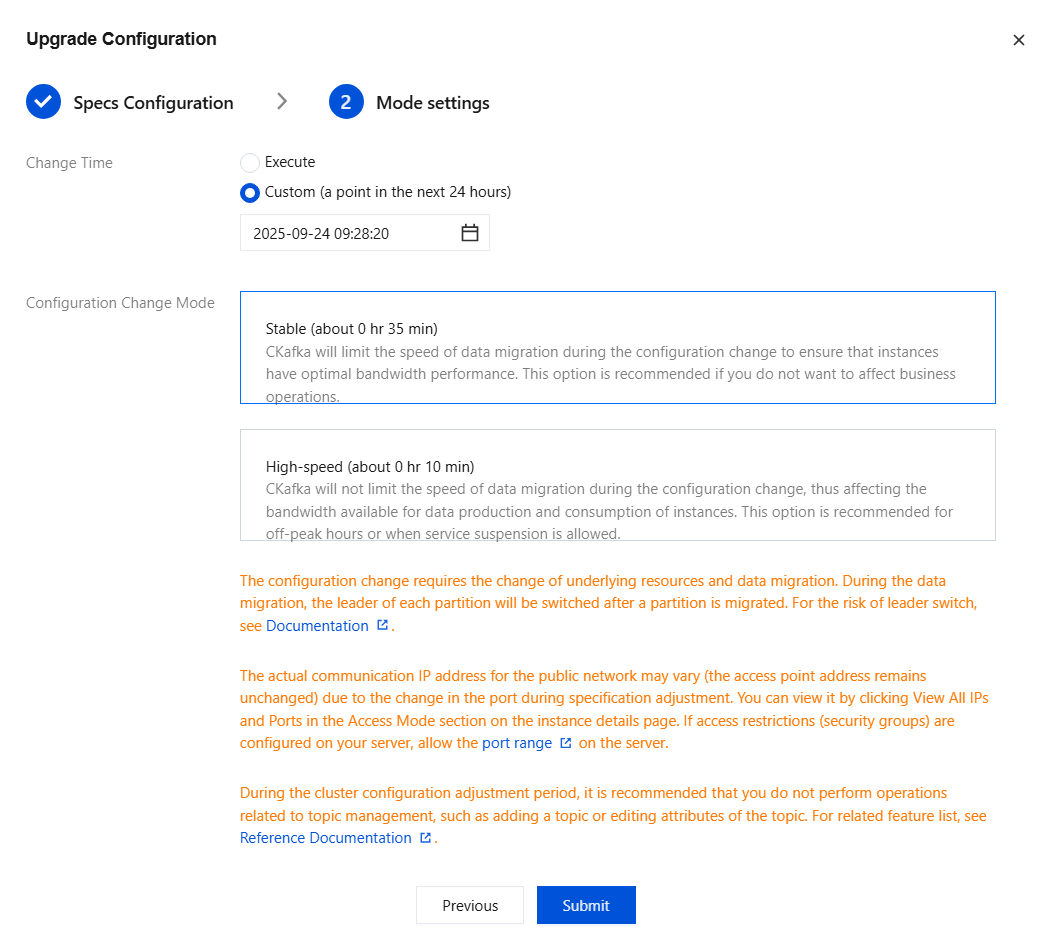 High-speed mode: CKafka does not limit the data migration speed during the upgrade process, which may affect the production and consumption bandwidth of the instance. This mode is suitable for off-peak hours or scenarios where service interruption is allowed.