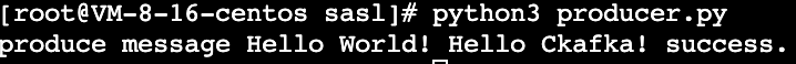 producer.py.producer = KafkaProducer(bootstrap_servers = ['xx.xx.xx.xx:port'],api_version = (1, 1),## SASL_SSL access in the public network.#security_protocol = "SASL_SSL",sasl_mechanism = "PLAIN",sasl_plain_username = "instanceId#username",sasl_plain_password = "password",ssl_cafile = "CARoot.pem",ssl_check_hostname = False,)message = "Hello World! Hello Ckafka!"msg = json.dumps(message).encode()producer.send('topic_name', value = msg)print("produce message " + message + " success.")producer.close()