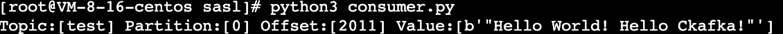 consumer = KafkaConsumer('topic_name',group_id = "group_id",bootstrap_servers = ['xx.xx.xx.xx:port'],api_version = (1,1),## SASL_SSL access in the public network.#security_protocol = "SASL_SSL",sasl_mechanism = 'PLAIN',sasl_plain_username = "instanceId#username",sasl_plain_password = "password",ssl_cafile = "CARoot.pem",ssl_check_hostname = False,)for message in consumer:print ("Topic:[%s] Partition:[%d] Offset:[%d] Value:[%s]" %(message.topic, message.partition, message.offset, message.value))