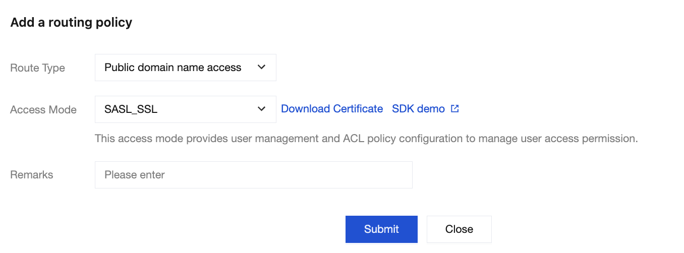 Routing Type: Public Network Domain Name Access > Access Method: SASL_SSL.