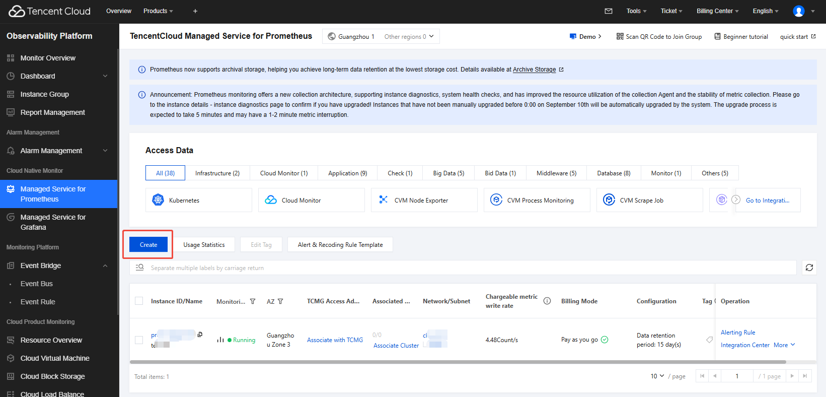 1. Log in to TCOP and select TMP. If no TencentCloud Managed Service for Prometheus (TMP) instance exists, click Create to create one. For detailed instructions, see Creating a TMP Instance. Note: