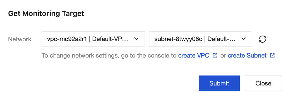 3. In the Prometheus Monitoring module, click Get Monitoring Target in the upper-right corner, and select a Virtual Private Cloud (VPC) network and subnet.