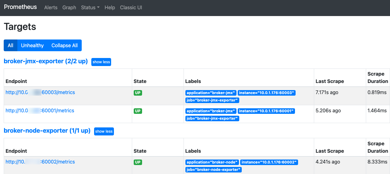 broker-jmx-exporter is the label for the Prometheus configuration to scrape the JMX metrics of the broker. The targets include the mapped port information.