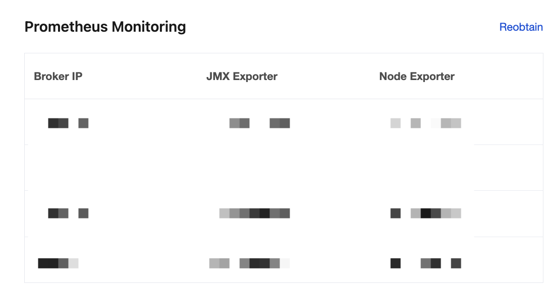 If the instance undergoes operations such as migration, specification change, or availability zone (AZ) change, the underlying brokers may migrate, causing Prometheus monitoring data to become unavailable. In this case, you need to click Re-obtain in the console to obtain the latest Exporter IP address and port.