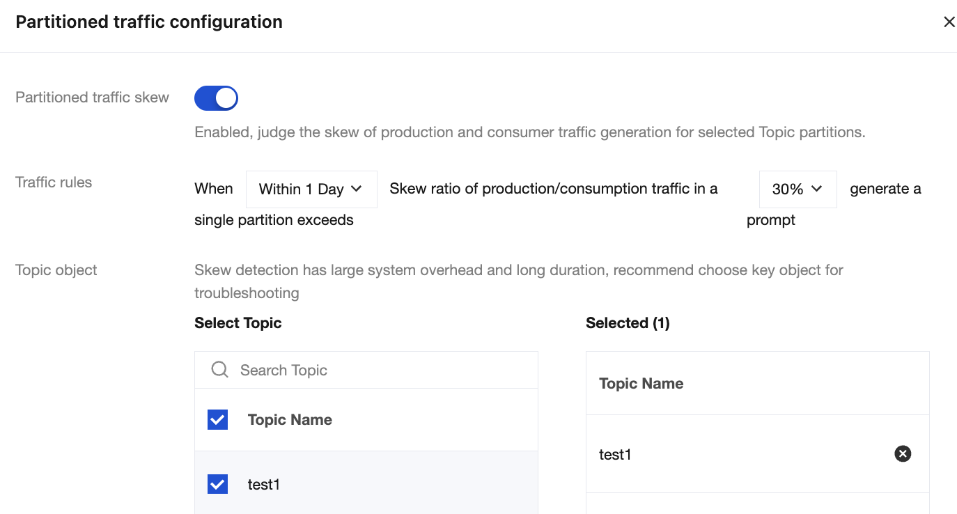 Enable Partitioned traffic skew. After it is enabled, the production and consumption traffic skew of partitions under the selected topic will be evaluated. The evaluation rule is whether the total production/consumption traffic volume of any single partition exceeds the specified proportion of the average traffic volume across all partitions in the topic within the specified time range.