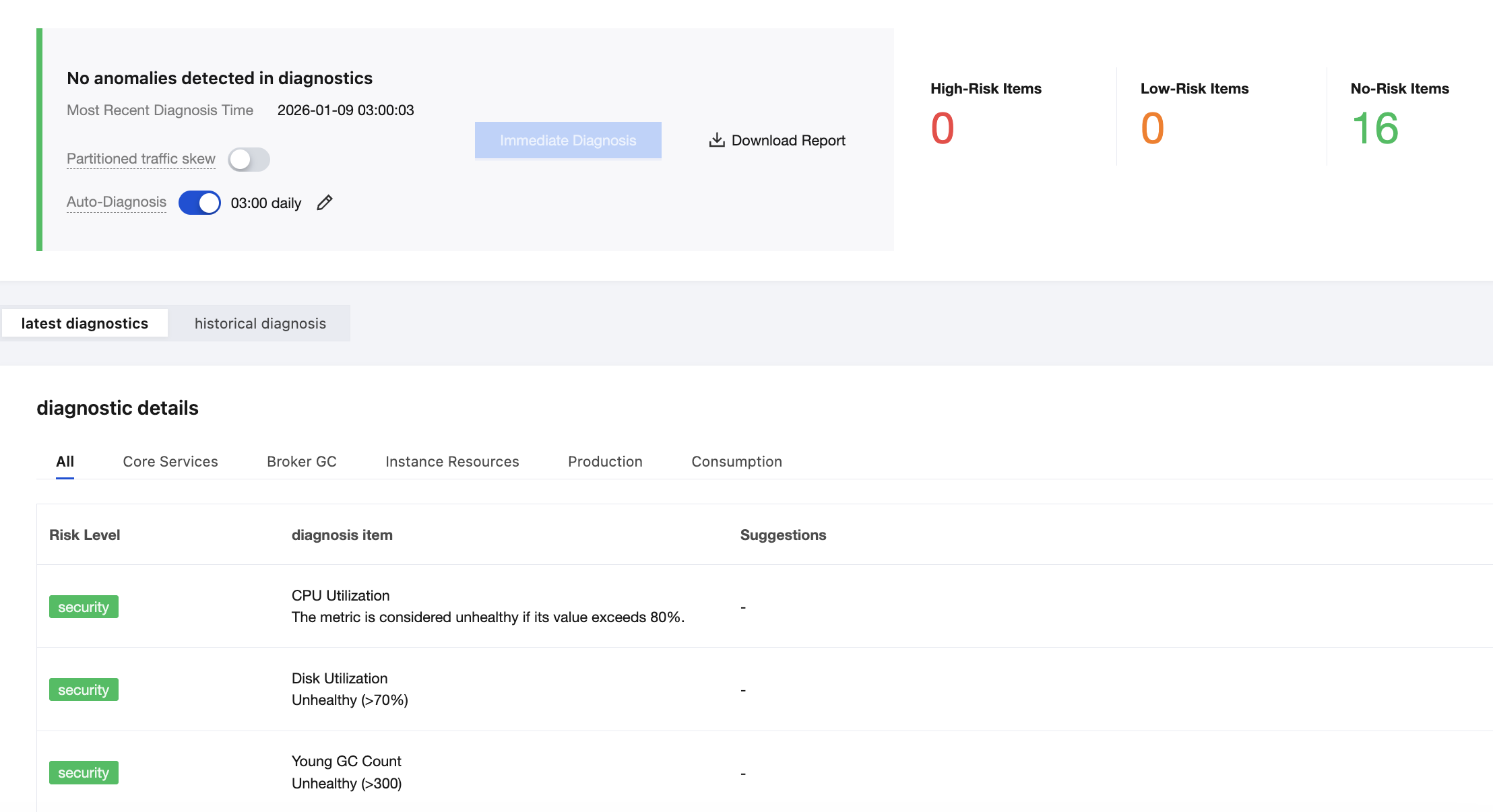 Enable Auto-Diagnosis. After it is enabled, diagnosis will be automatically triggered once per day at the specified time, and a diagnosis report will be generated. If you modify the diagnosis time and the diagnosis is not triggered on that day, it indicates that the scheduled diagnosis time has not arrived, and automatic diagnosis will be triggered at your modified time. If your modified diagnosis time has already passed, automatic diagnosis will not be triggered on that day.