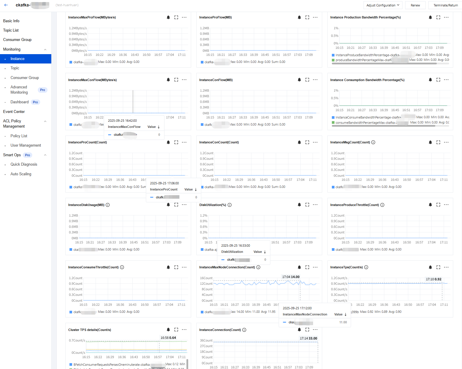 You can view the traffic monitoring data on the monitoring page in the CKafka console to check whether there is a surge, and if so, upgrade the instance specification for solution.