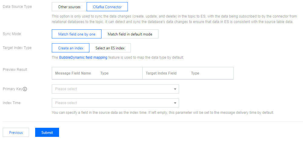 Synchronization mode: If you select field-by-field matching, you can customize the mapping relationship between the custom message field name and the target index field. If you select default field matching, the message key will be used as the field name in the ES index mapping.
