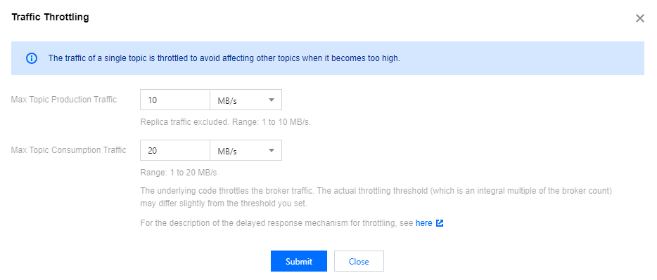 Max Topic Consumption Traffic: The value ranges from 1 MB/s to the maximum bandwidth purchased for the instance. Since traffic throttling is implemented at the broker level, the actual traffic throttling value (which equals an integer multiple of the number of brokers) may differ slightly from the configured value. For details about the soft traffic throttling mechanism, see Traffic Throttling Mechanism. Use Cases for CKafka Traffic Throttling