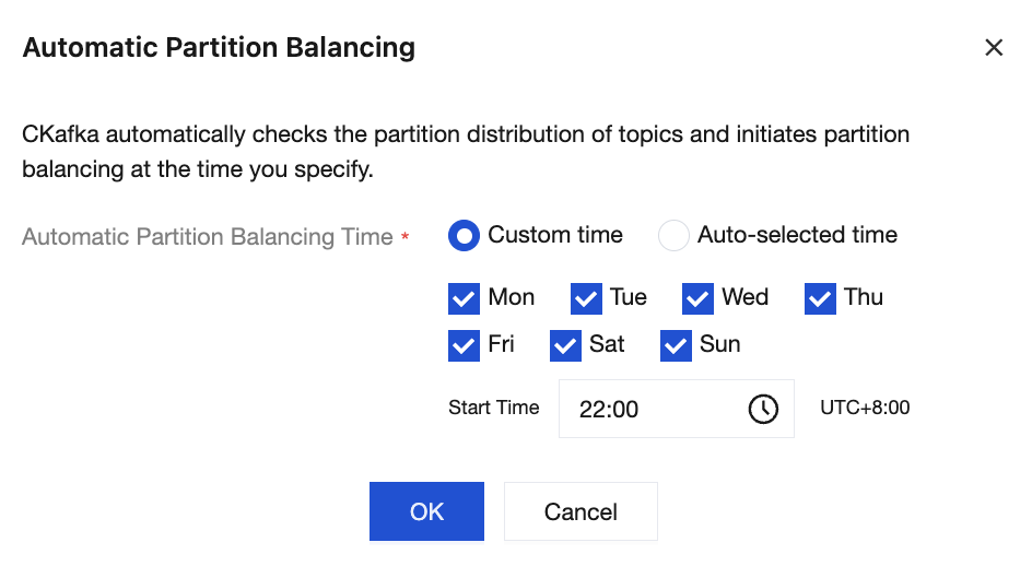 Auto-selected time: CKafka selects the time for initiating partition balancing during off-peak hours determined through automatic analysis.